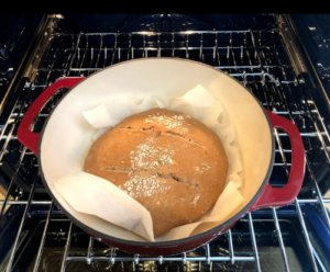 - Take the preheated dutch oven out and set aside. Grab the parchment paper with the dough inside and place it in the dutch oven (including the parchment paper). Place the lid back on and bake at 450 F for 30 minutes.