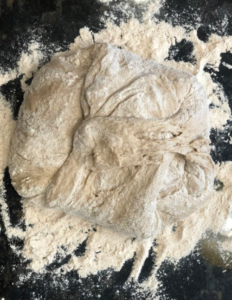- Place the dough on a floured surface and generously sprinkle some additional flour on top. Keep folding while you sprinkle more flour as needed until the dough is not sticky.