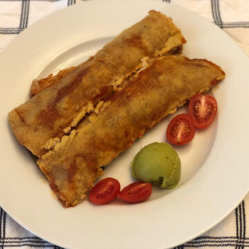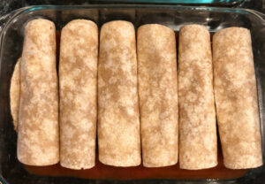 - Place filling in the tortilla, roll-up and place it in the casserole dish. Repeat for the remaining filling/tortilla.