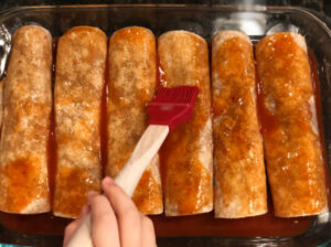 - Pour the remaining enchilada sauce over the rolled enchiladas and spread to coat the entire area.
