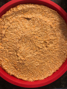 - Spread the batter into two round 9 inch diameter silicone baking pans. Bake for 45 minutes.