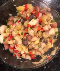 - Add the potatoes to a pan and cover them with water (skin on). Shimmer until the potatoes are tender. Transfer to a colander /bowl and let cool to room temperature.