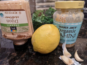 - Add the tahini sauce, Dijon mustard, lemon juice, minced garlic and pepper to a small bowl and mix well. Add water to get the desired consistency.
